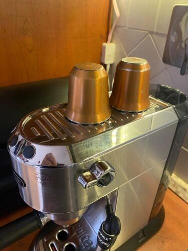 - settare 2 tazzine, prendendo su una tazzina la prima doppia uscita per qualche secondo lasciando nella seconda tazzina la parte finale più chiara. La prima tazzina, se preriscaldata con acqua calda presa dalla macchina stessa, si avvicina molto al caffè del bar mentre la seconda dà un caffè più leggero (per chi lo gradisce) che io utilizzo per il cappuccino della mattina dopo;