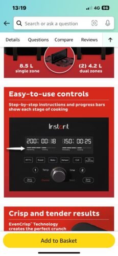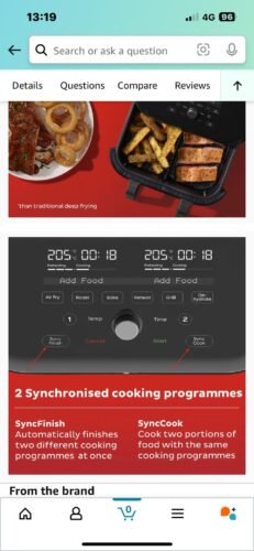 Following years of avoiding purchasing an air fryer, due to adverse comments on the chemicals emitted on the digestive system, my husband strongly persuaded me to invest in one of these and he chose this one. It’s a man thing. I wasn’t convinced at first wanting a smaller model but he mentioned that what will hold a lot will hold a little, a Lancashire maxim. I am more than pleasantly surprised after only one week although haven’t used all the functions yet. I cooked butcher’s sausages previously frozen from fresh in the air fryer on the air fry setting in compartment one and good quality cherry tomatoes in the other. I forgot to press sync but I managed to time the food. (I’m 64 and have been cooking for 50 years at least without one of these. I wish I had one when my lads were small.) I must say both sausage and tomatoes were absolutely delicious, to my delight and amazement. The large tray is great and separator is a practical gadget. All is easy to clean using kitchen rolls initially then hot water and a little washing up liquid. I can’t wait to try a full guinea fowl or chicken in the large pan. If you enjoy food and cooking in general you will appreciate one of these models if you have the room. I have a small kitchen so have whizzed my deep fat fryer. No, I’m giving it to charity. Make space for one of these if you need to and be prepared to be amazed.