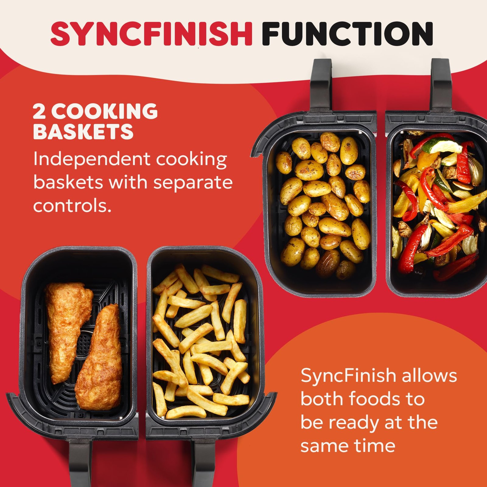 I specifically wanted a dual basket fryer as I wanted the option of cooking different foods at the same time, the Vortex plus does this with consummate ease as it has a sync finish function which allows you to have both baskets finishing at the same time regardless of the amount of cooking time or temperature each basket needs, it also has a sync finish for both baskets to finish simultaneously if you want to bulk cook both baskets with the same food, (cook fries or whatever).