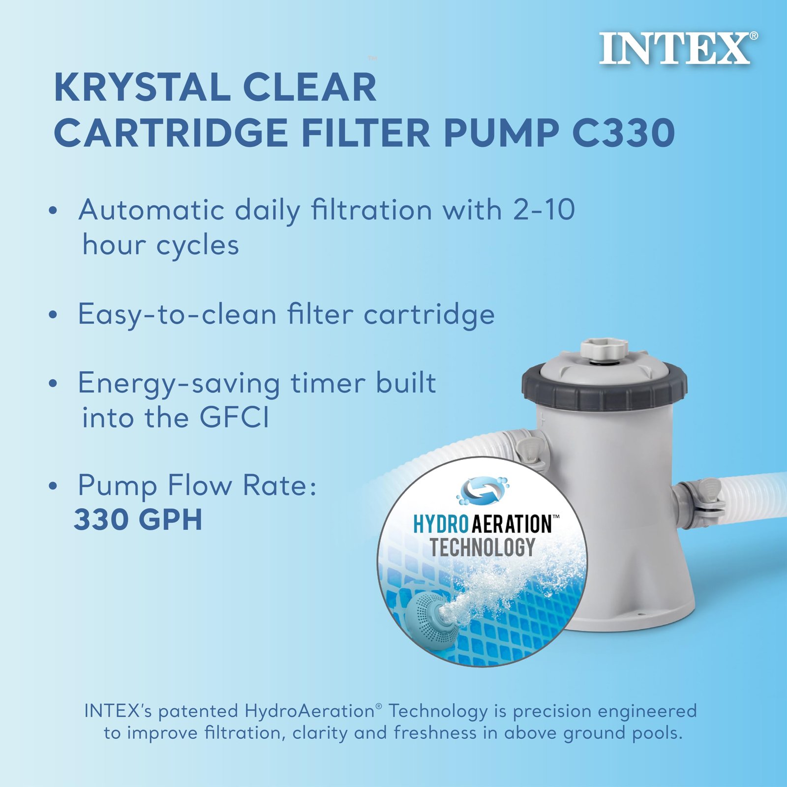 • Replace the Pump that comes with it with the Intex C1,000 Pump. The pump included is woefully under powered. The C1,000 circulates more water per hour (3x’s faster than what’s included) so you don’t have run it as much.