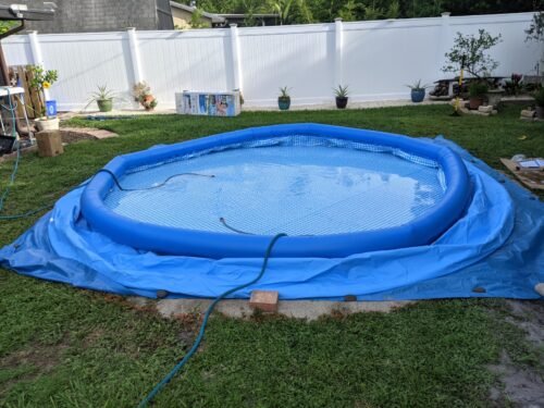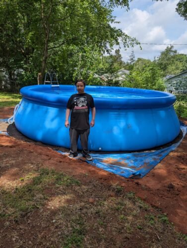 I’m sharing pictures of the pool when it’s level and filled. You’ll also see a photo of my 5’2” son standing beside the pool when it’s all set up. The pump works pretty good too. Despite the stress and effort, it was worth it in the end. When set up correctly, it’s definitely an enjoyable pool!