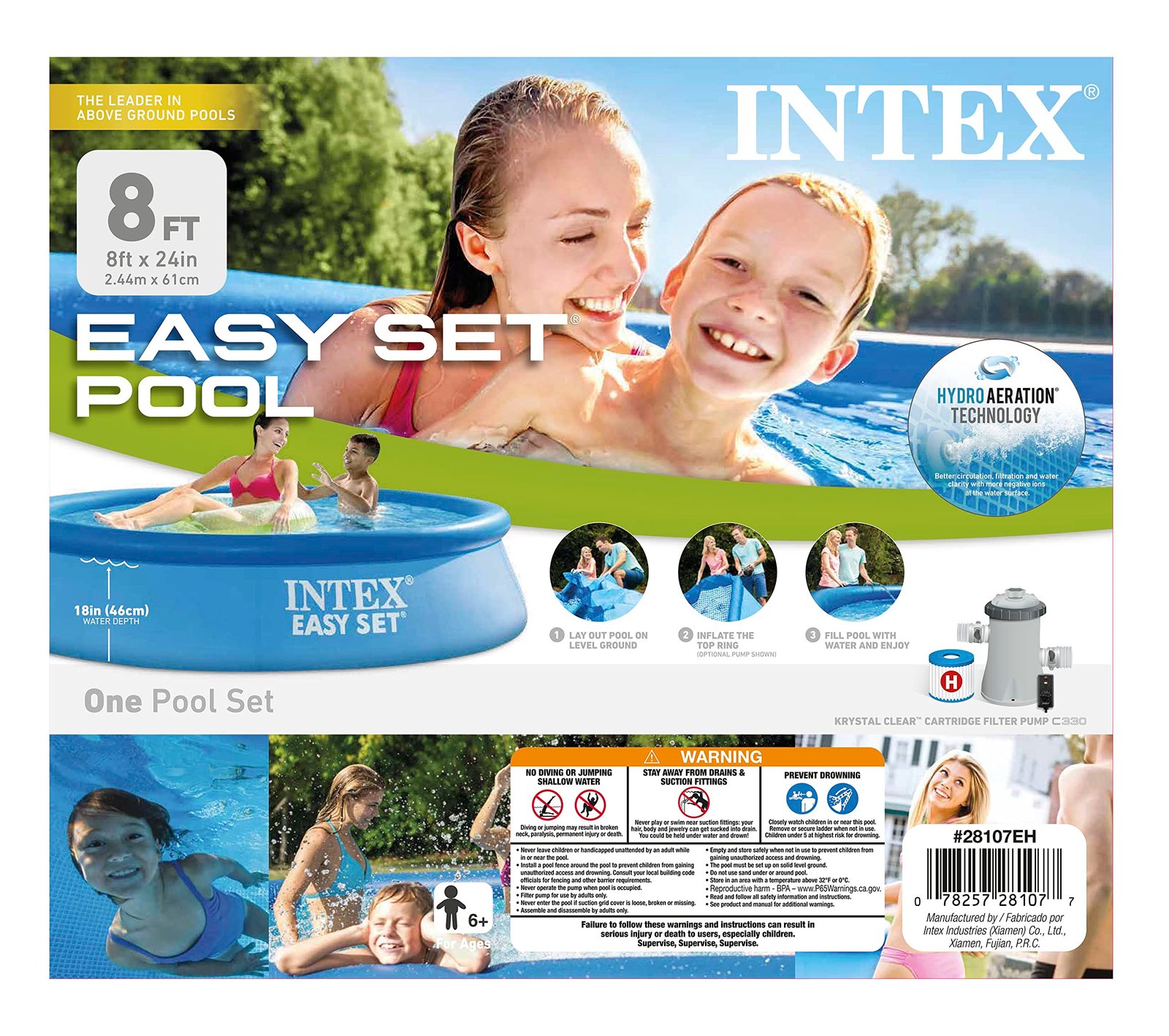 We bought the 12 foot version in May of 2016. It's worked great so far. It took about an hour to setup. I used a tarp underneath which Intex does not recommend, but we did it anyway to protect the bottom. It took about 3-4 hours to fill up the pool. This one comes with the pump and filter setup which is a must to keep the water clean. We also bought some basic pool chemicals, and both available covers by Intex. The cover we use the most is the solar cover. Where we live its around 90-100 degrees F daily. You should also have a strainer for this pool to get the leaves and larger organic matter out of the pool. The included pump/filter setup is really just the get the stuff the strainer can't get.