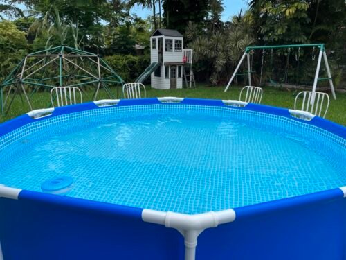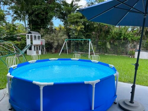 Pool with pump, net, vacuum, cover, and tablets and I’m under $300. I will have to eventually buy more tablets and I’m considering getting the 1000 gph pump with skimmer but this thing is so low maintenance I’d be doing more out of intrigue. Plus the skimmer hangs on the edge and takes pool space away. We’ll see. Fun easy little project, kids love it, 4 adults fit easy, low maintenance.