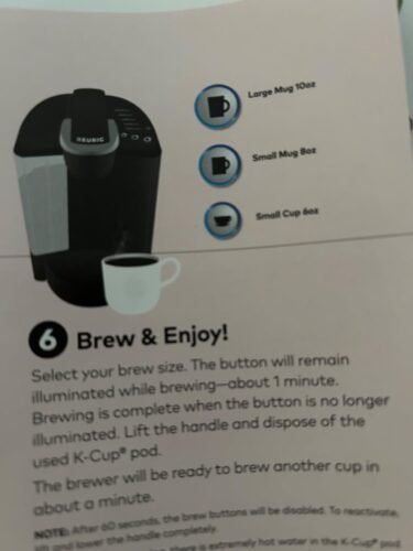 Brewing: To brew a cup of coffee is very simple. You'll need to turn on the brewer by pushing the power button. The power button and heating lights will illuminate and the Keurig will make some noises while it heats up. When the three cup sizes illuminate in blue, you know it's time to brew your coffee. Set your coffee mug on top of the drip tray and lift the handle for the K-cup pod holder. Place a K-cup pod in the holder and lower the handle completely until the three cup sizes are blinking. The three sizes are: small cup (5.25 ounces), small mug (7.25 ounces) and large mug (9.25 ounces). Select your size and the coffee will be ready in about a minute. If the water reservoir is low on water, the "add water" light will illuminate and the process won't continue until you've filled the reservoir. Once it's stopped dripping, you may remove your mug and enjoy your coffee! If someone else wants to brew a cup of coffee right after yours is done, all they have to do is remove your K-cup pod since they are single-use pods, add theirs and repeat the process.