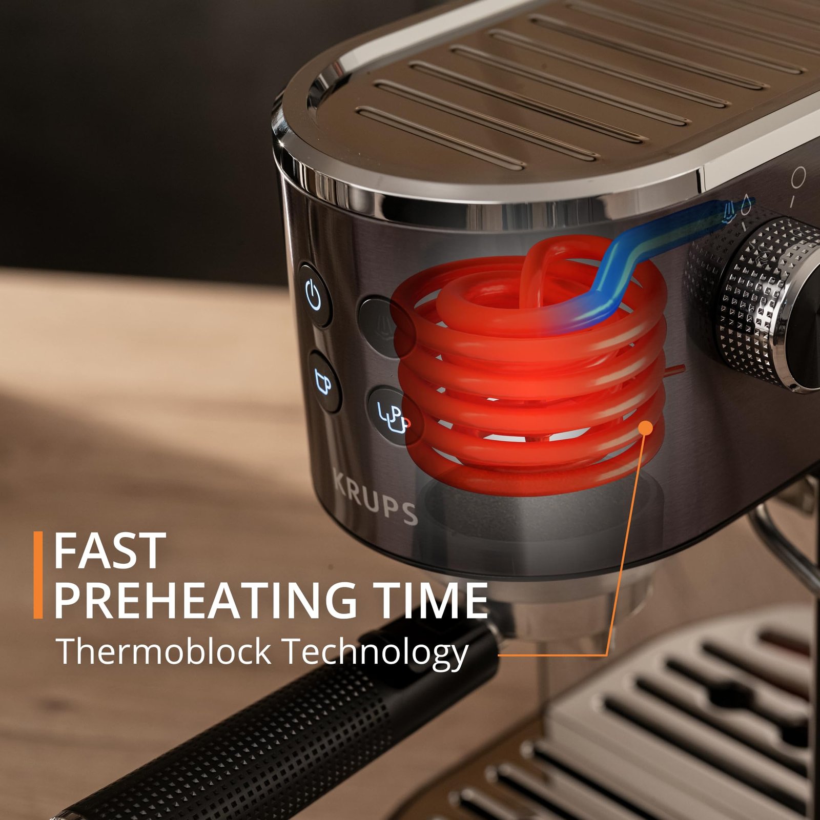 Krups Virtuoso+ XP444GG0 Pump Espresso Machine – Compact Design with Auto Flow-Stop & Dual-Mode Steam Wand, Black Stainless Steel