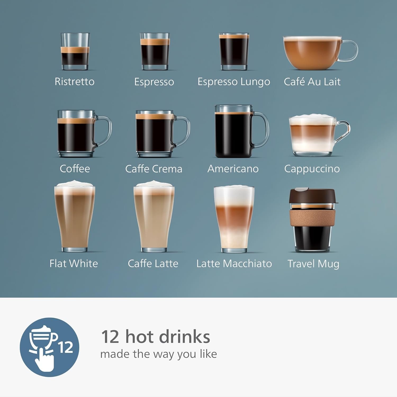 - 12 One-Touch Beverages: Choose from espresso, coffee, cappuccino, latte macchiato, Americano, caffè crema, caffè latte, ristretto, café au lait, iced Americano and more.