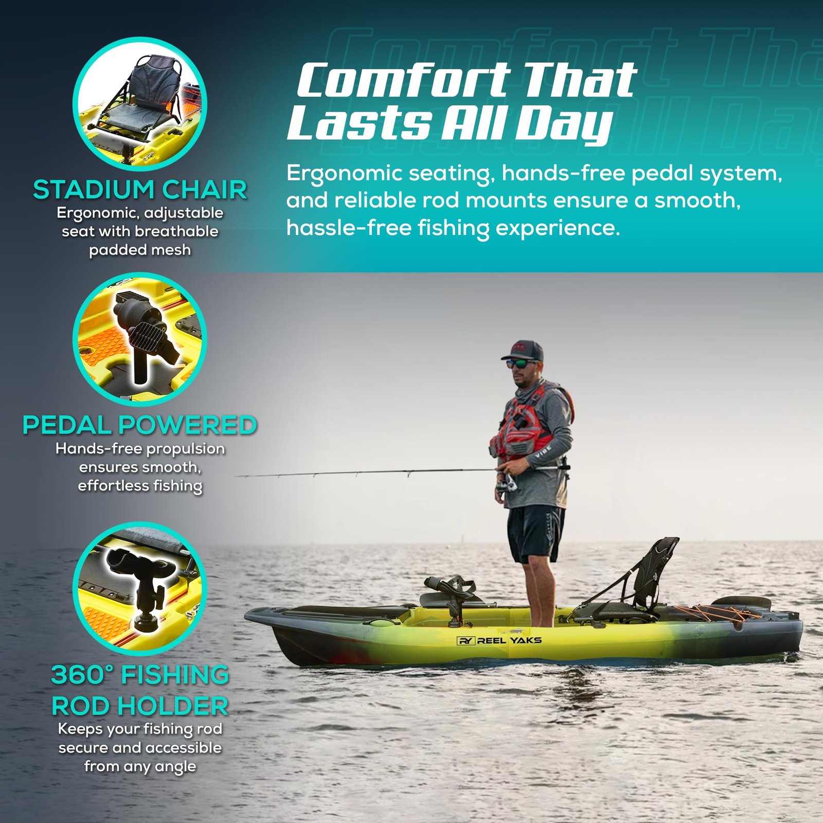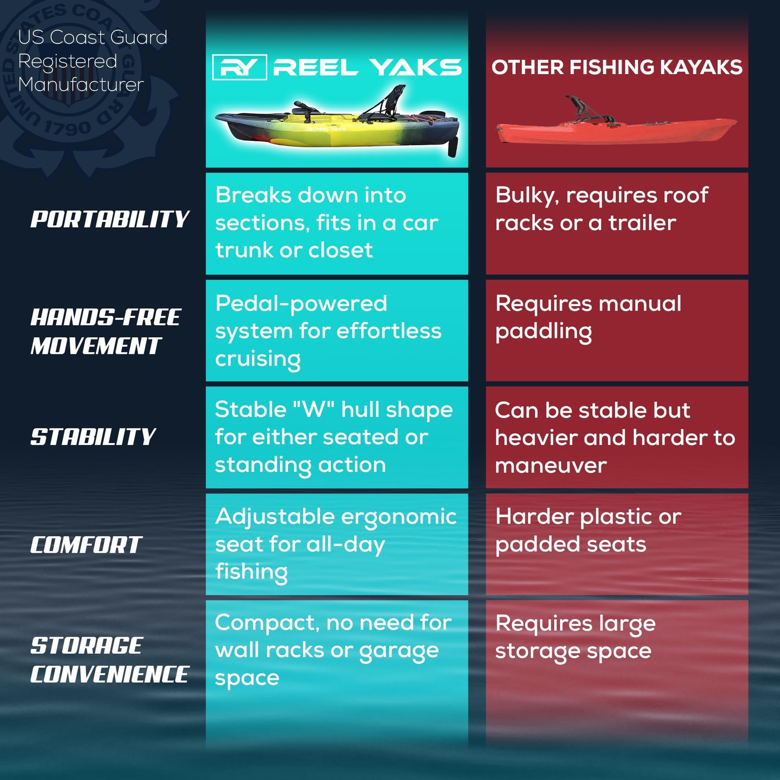 - Stable “W” Hull Design: Engineered for both seated and standing casts, the W-shaped hull provides exceptional balance and tracking in calm lakes, rivers, or choppy coastal conditions.