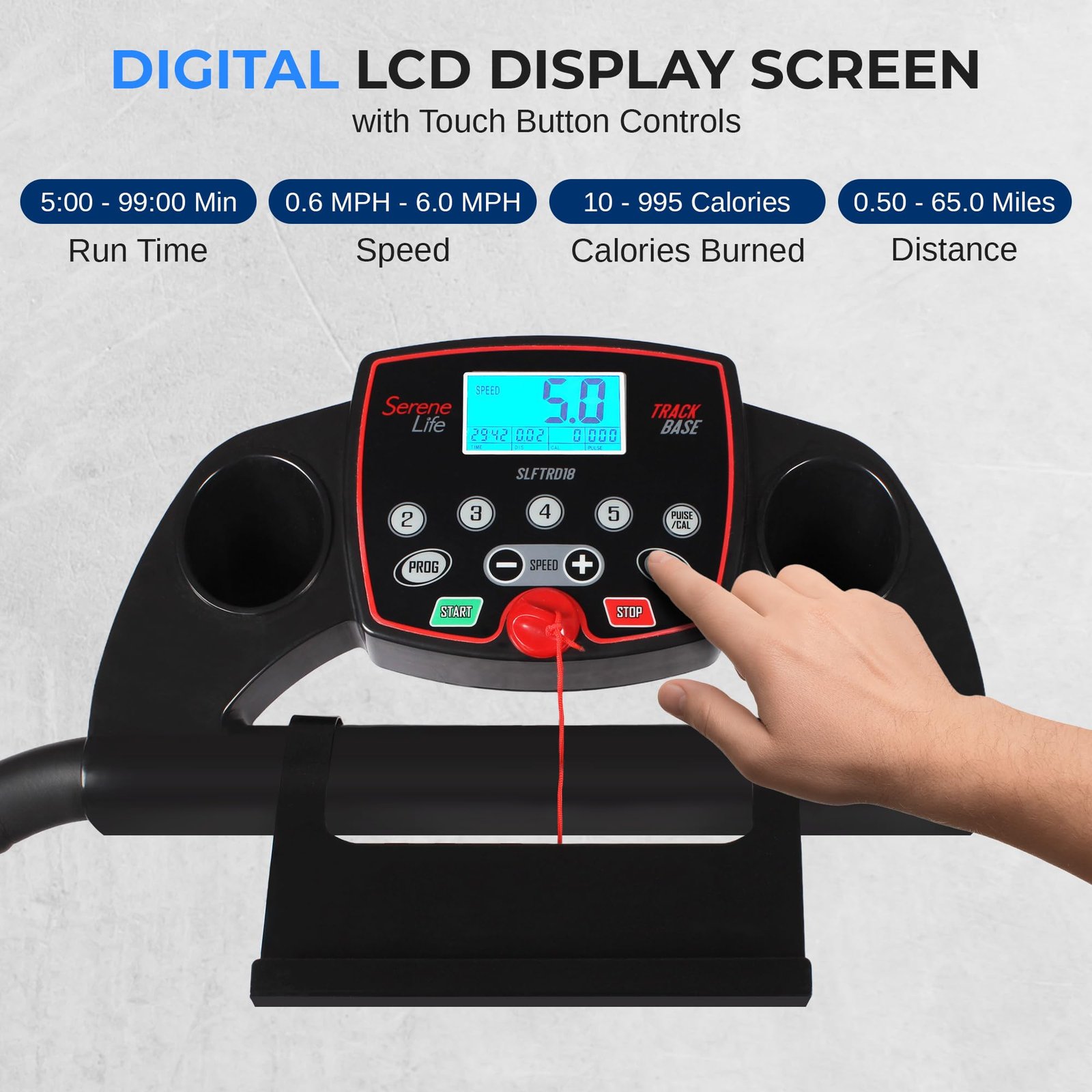 The SereneLife SLFTRD18 folding treadmill offers a smart, space-saving design with Bluetooth app connectivity via “FitShow,” a bright LCD touchscreen, and built-in hand-grip heart-rate sensors. Perfect for walking, jogging, or running, it supports up to 265 lbs and features 12 preset workouts plus manual speed and incline controls.